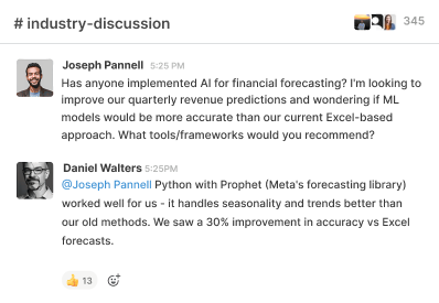 Learners gain access to a local Wall Street Prep AI for Business & Finance Certificate Program Slack Channel, designed to facilitate local connection for a global certificate. Stay up to date on all the innovative ways our community is implementing AI into their roles.